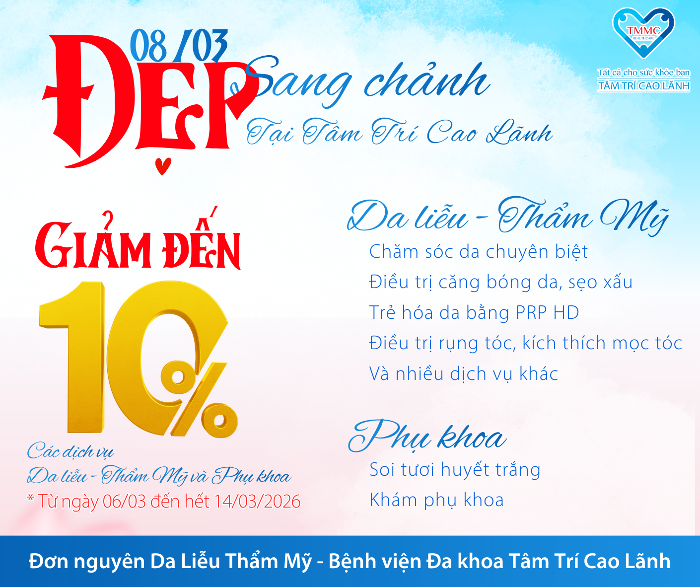 Nhân dịp Quốc tế Phụ nữ 08/03, Bệnh viện Đa khoa Tâm Trí Cao Lãnh xin gửi lời chúc tốt đẹp nhất đến một nửa thế giới. Để tri ân và đồng hành cùng phái đẹp trên hành trình chăm sóc sức khỏe và nâng tầm nhan sắc, chúng tôi mang đến chương trình ưu đãi đặc biệt: