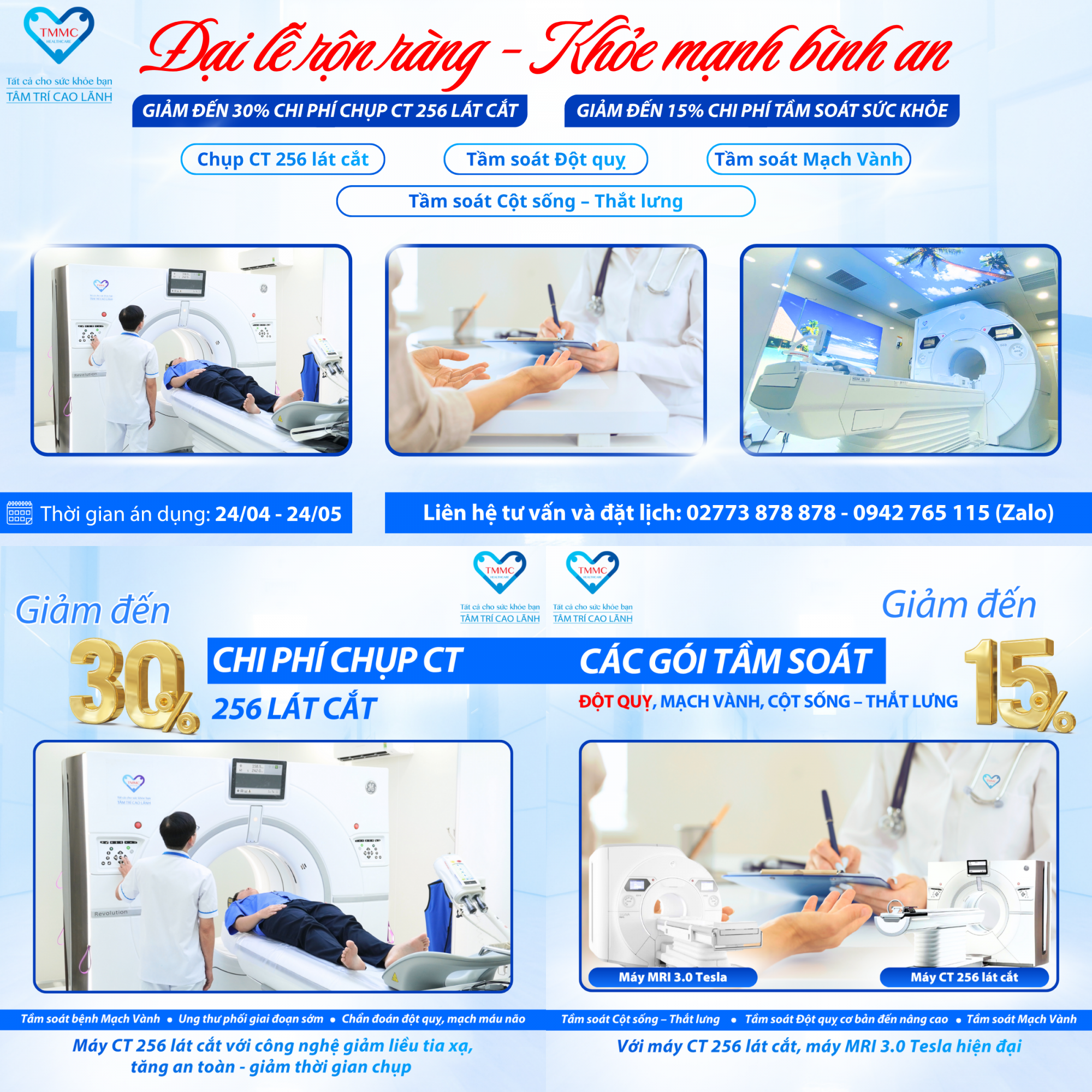 Nhân dịp kỳ nghỉ lễ Giỗ Tổ và 30/4 - 1/5, Bệnh viện Đa khoa Tâm Trí Cao Lãnh (Tâm Trí 2) mang đến chương trình tri ân sức khỏe đặc biệt nhất trong năm! Với sự hỗ trợ của hệ thống chẩn đoán hình ảnh tối tân (CT 256 lát cắt và MRI 3.0 Tesla), chúng tôi giúp bạn phát hiện sớm mọi nguy cơ tiềm ẩn với mức chi phí cực kỳ tiết kiệm: